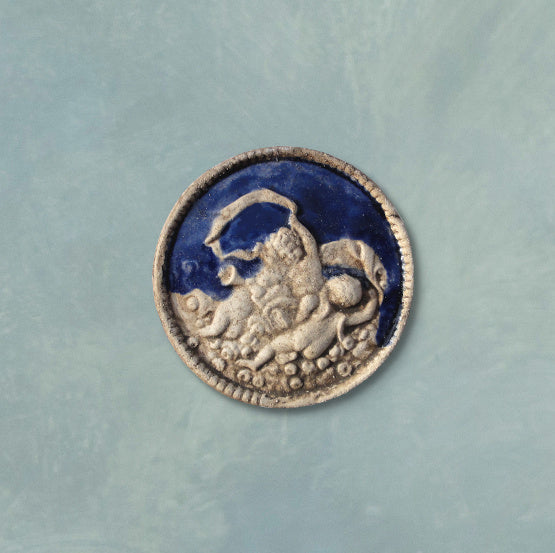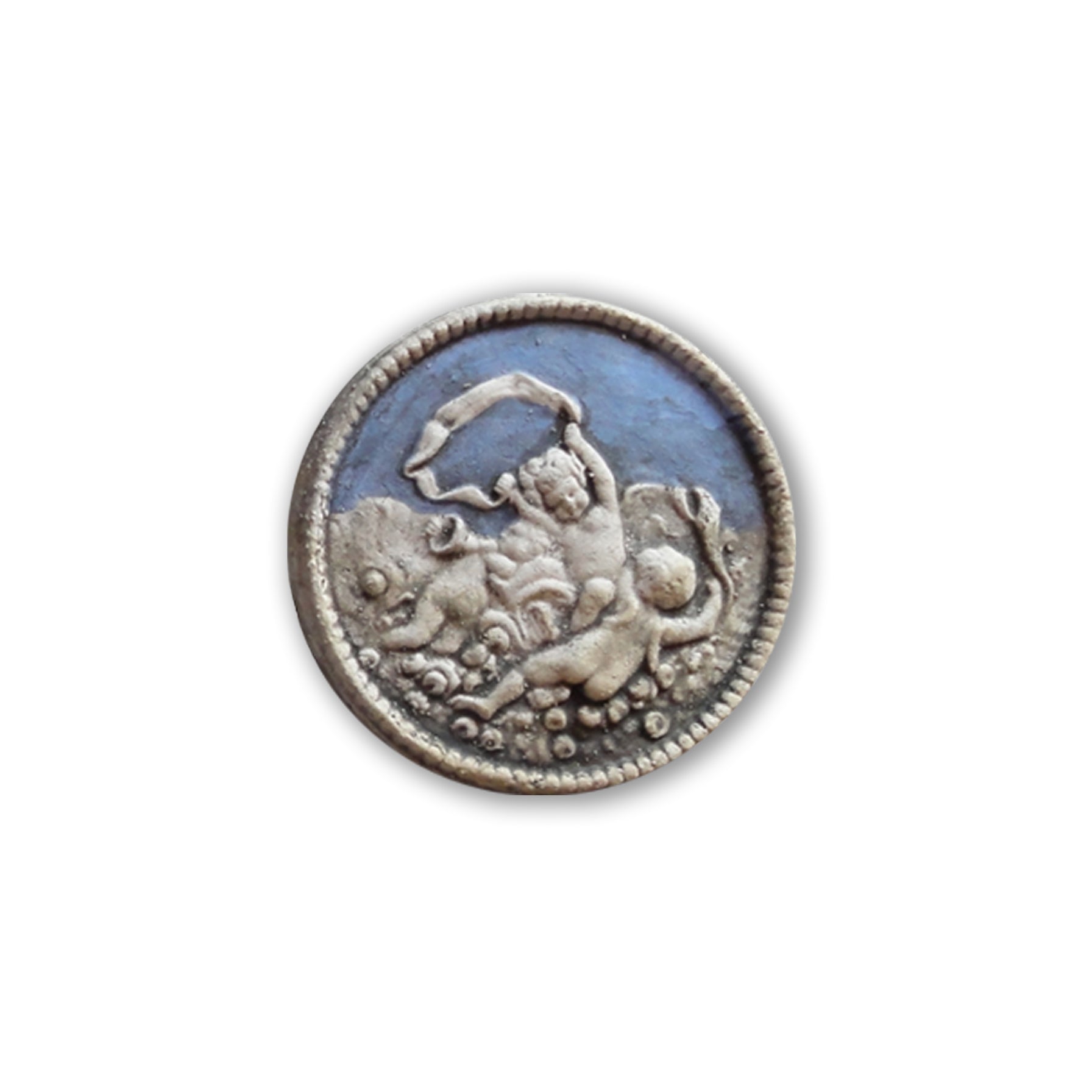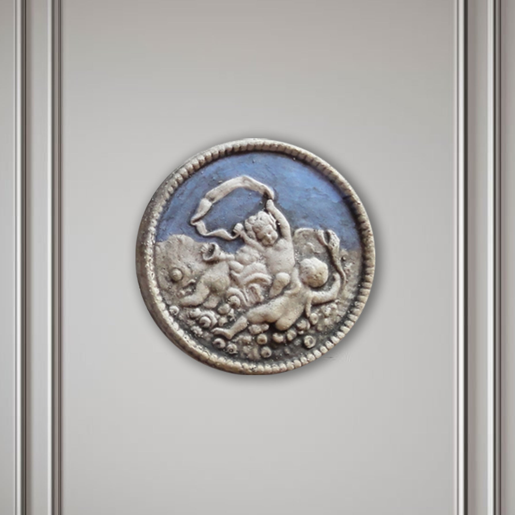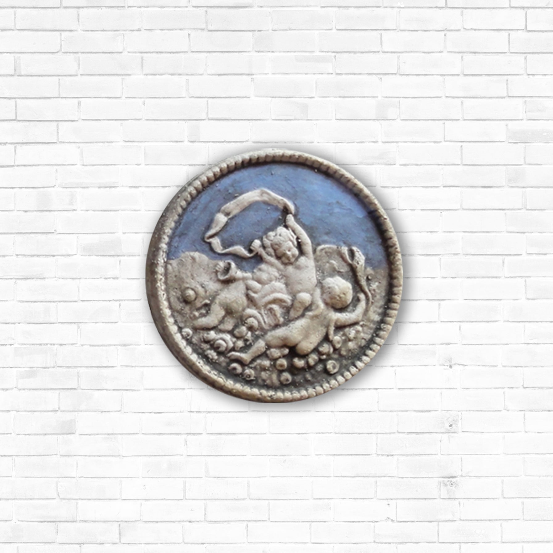 The beautiful handcrafted little bas-relief depicts three Putti playing music in the sky. The cameo, inspired by a neoclassical gem, is available in different colors and glazes, light blue, turquoise, blue, green, and lilac.