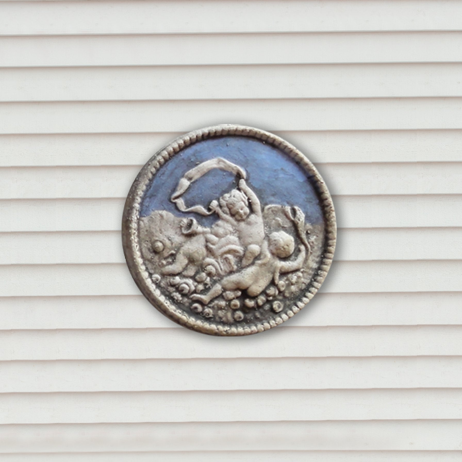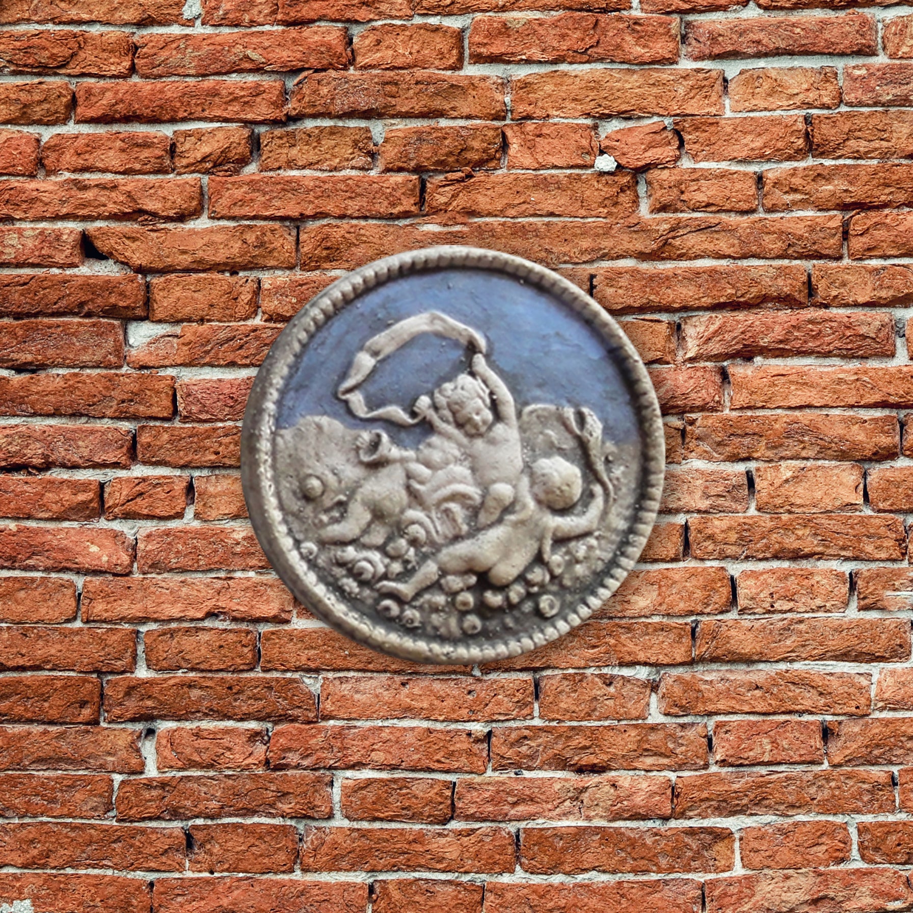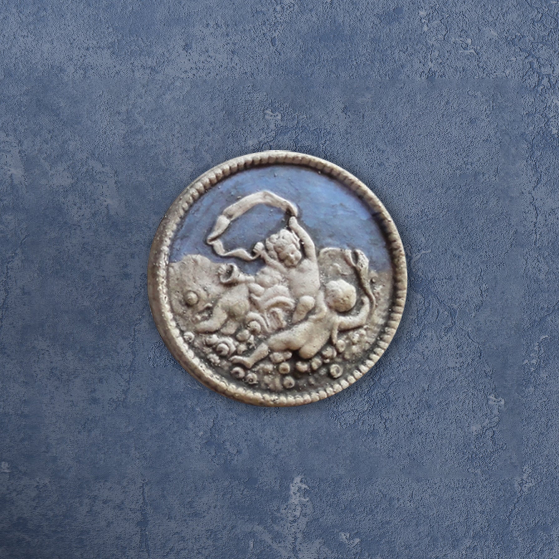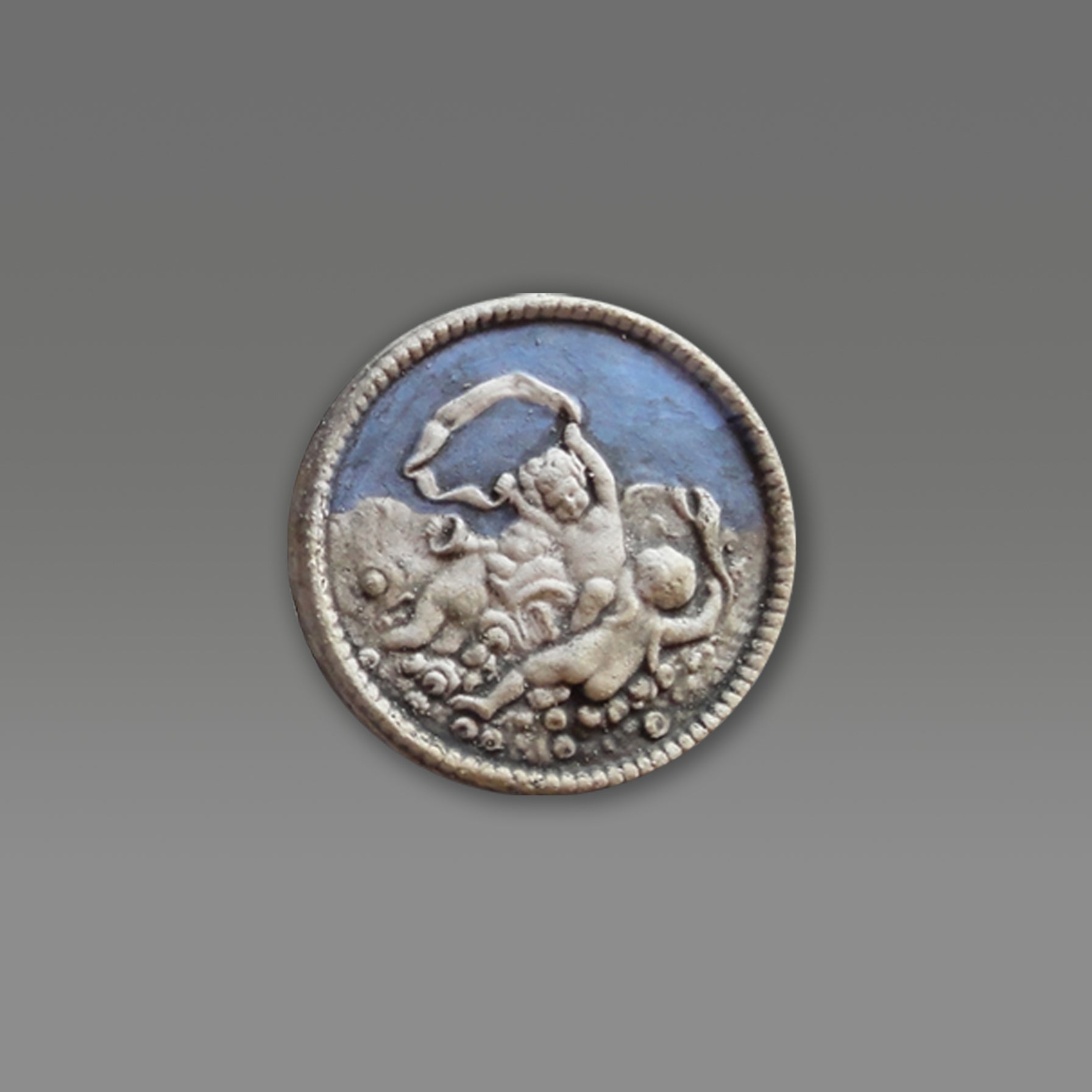 The beautiful handcrafted little bas-relief depicts three Putti playing music in the sky. The cameo, inspired by a neoclassical gem, is available in different colors and glazes, light blue, turquoise, blue, green, and lilac.