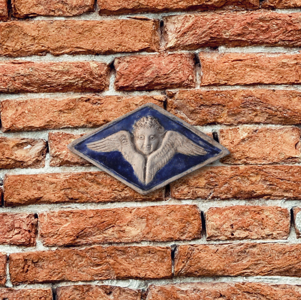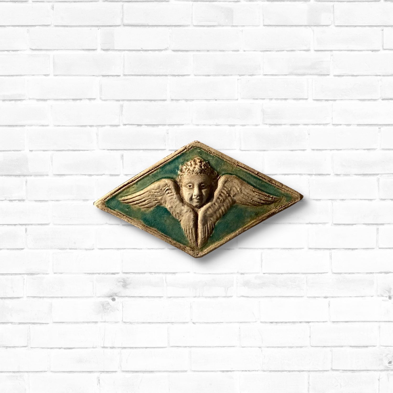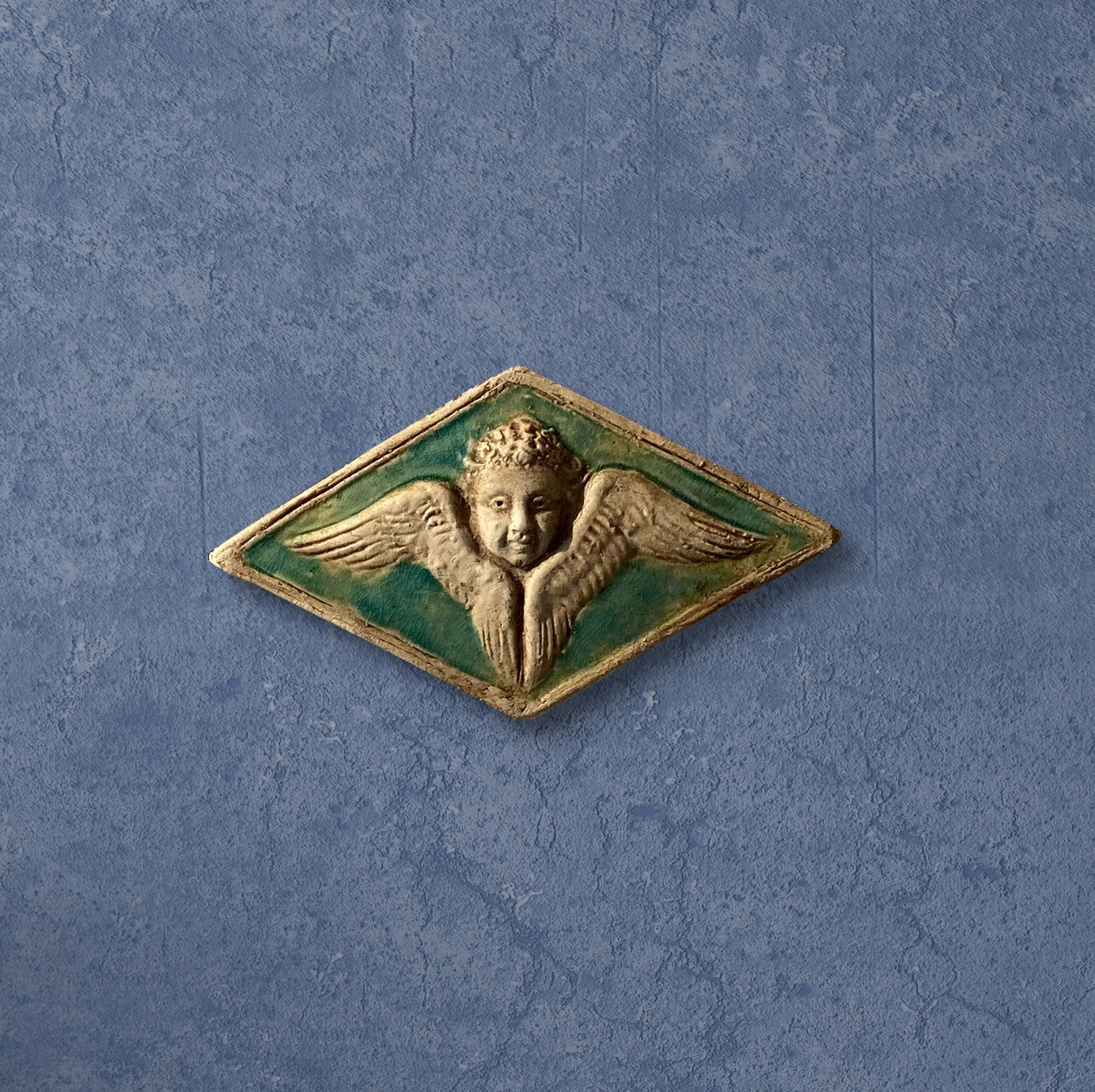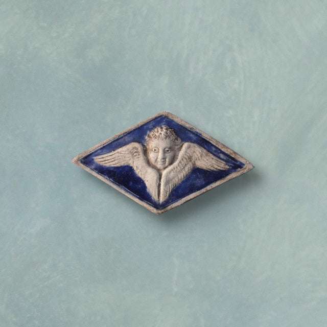 Elegant, handcrafted bas-relief depicting a winged cherub. This detailed cameo is available in different colors and glazes: light blue, turquoise, blue, green, yellow and lilac.