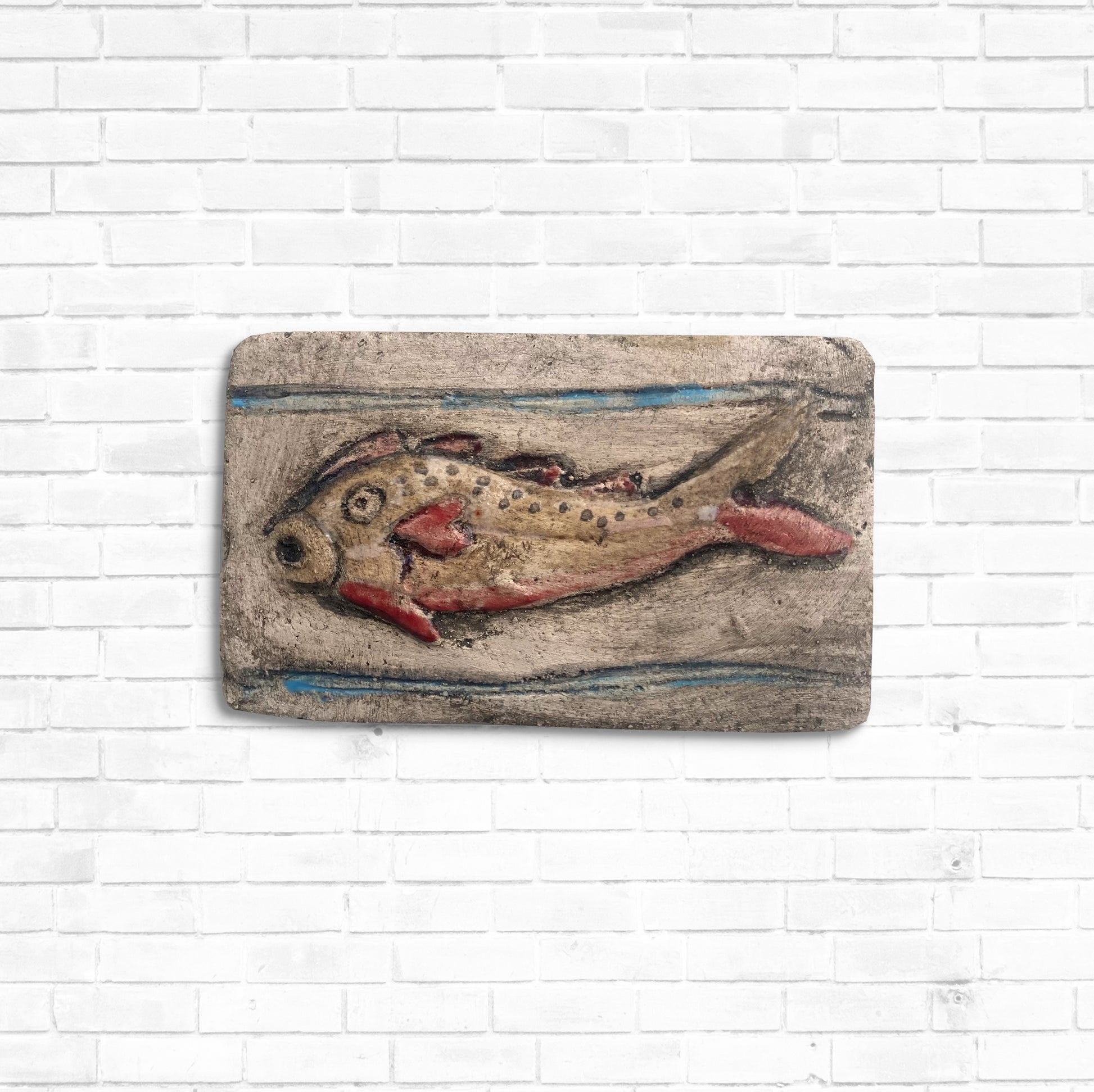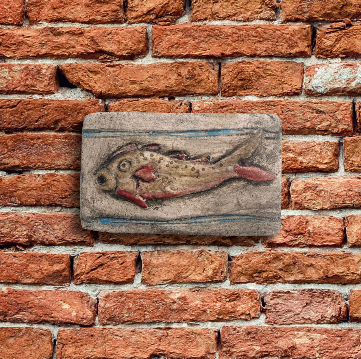This colorful, handcrafted little bas-relief depicts a red fish swimming in the sea, and it is inspired by the spectacular mosaic pavement in the Cathedral of Aquileia, Northern Italy. One of the most beautiful scenes represented in this mosaic (the oldest and largest in Western Christianity) is that of the Fishing Cupids, in which many angels catch fish from the blue sea. The Red Fish modeled by Ithaca is one of the many sea creatures depicted on this astonishing, ancient mosaic. Aquileia, Basilica di Santa Maria Assunta, IV century A.D.